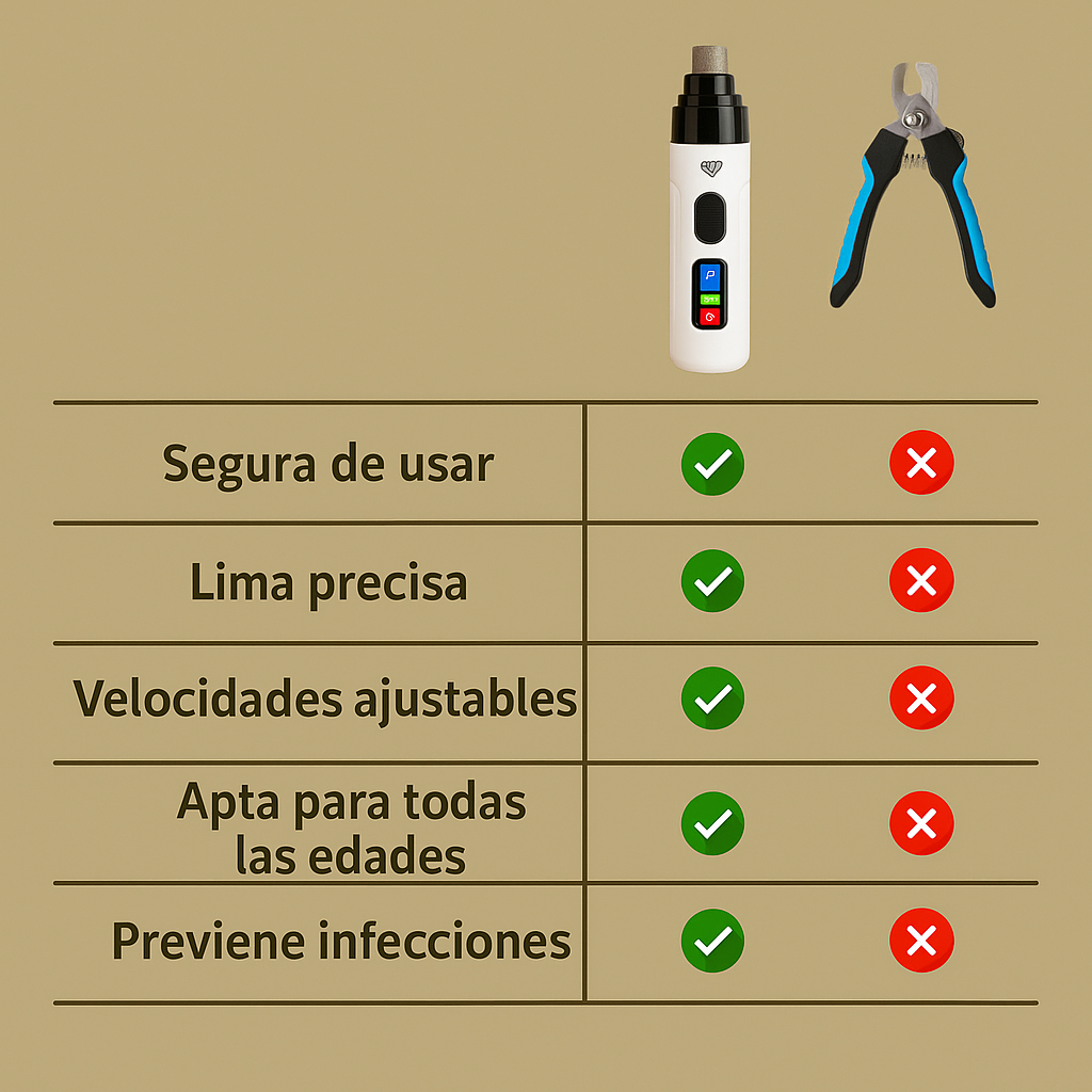 La limadora eléctrica es la opción más segura y eficaz frente al cortaúñas tradicional. Ofrece precisión, suavidad, velocidades ajustables y previene infecciones, todo pensado para cuidar a tu mascota sin estrés ni riesgos. Además, está avalada por veterinarios, quienes la recomiendan por ser menos invasiva y más segura que el corte convencional. Es una herramienta moderna, fácil de usar, ideal tanto para dueños primerizos.